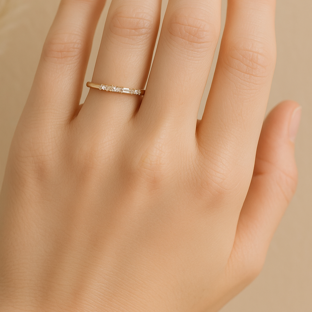 Radiating contemporary elegance, the Aurora Emerald Stacker is a modern twist on classic design. Featuring alternating emerald-cut and round zircon stones, this ring catches light at every angle, delivering a soft shimmer that's perfect for stacking or wearing solo. Crafted in 925 sterling silver and gold-plated for lasting brilliance, it’s a versatile piece that elevates both everyday wear and special occasions.